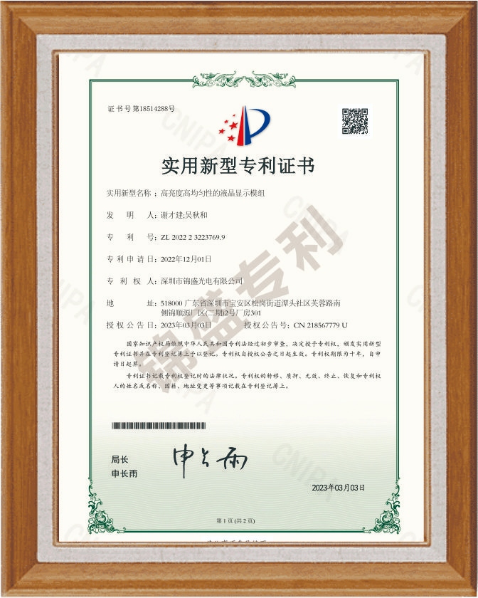 > 高亮度高均勻性的液晶顯示模組實用新型專利證書