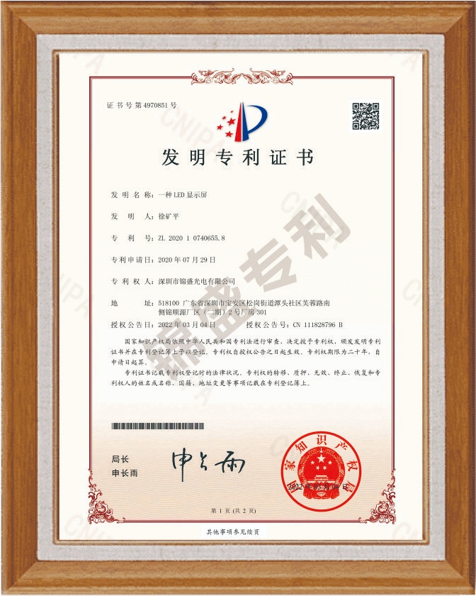 > 一種LED顯示屏發(fā)明專利證書